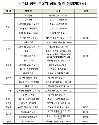관내 무더위쉼터 위치는 김포시청 홈페이지 → 분야별정보 → 안전·민방위 → 재난안전시설 → 무더위쉼터에서 확인할 수 있고 국민재난안전포탈에서도 확인할 수 있다.