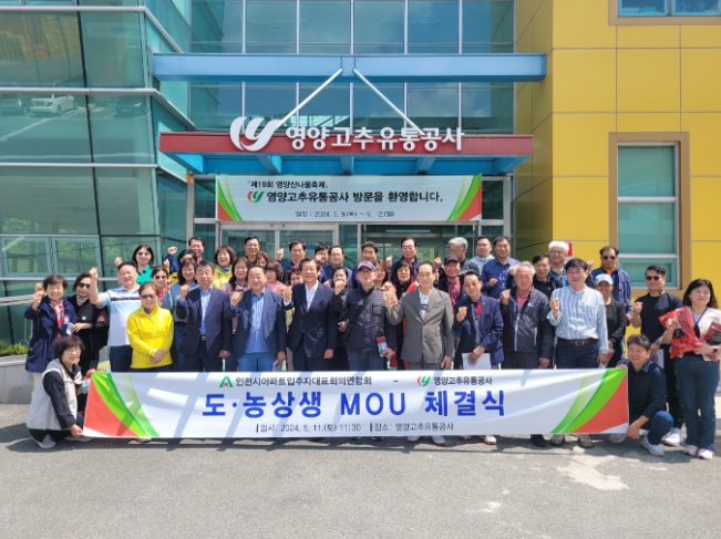 [뉴스서치] 영양고추유통공사(사장 최현동)는 5월 11일 토요일 인천시아파트입주자대표회의연합회와“빛깔찬 고춧가루 직거래 공급”MOU업무 협약을 체결했다. 이날 인아연에서는 회장을 비롯하여 50여명의 입대의회장, 영양군과 영양고추유통공사 관계자 등 20여 명이 참석했다.