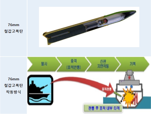 작년 11월 전투용 적합 판정을 획득한 76mm 철갑고폭탄은 표적에 충돌하는 즉시 폭발하는 기존 고폭탄과 달리 적 선체를 관통한 후 충격지연신관이 작동하여 선체 내부에서 폭발하도록 설계된 것이 특징이다.