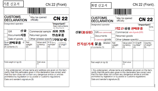 새로 개정되는 국제우편 세관신고서에는 기존 ‘판매물품’을 대신하여 ‘전자상거래 물품’과 ‘기업간 판매물품’ 항목이 신설되며, 2026년 6월부터 전 세계 192개국에서 시행될 예정이다.