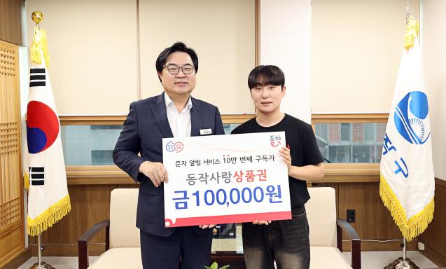 먼저, 지난 23일 10만 번째 구독자인 박창원씨(26)를 구청장실로 초청해 기념 행사를 갖고, 동작사랑상품권 10만 원을 증정했다.