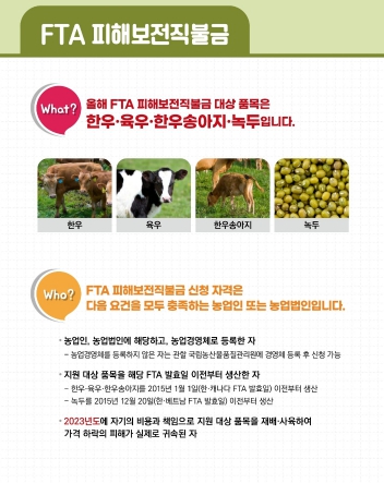 피해 보전직불금은 FTA로 수입량이 급격히 증가해 가격이 하락한 품목에 대해 피해 일부를 보전하는 제도로써 신청·접수는 한-캐나다 FTA 협정 발효일인 2015년 1월 1일 이전부터 한우, 육우, 송아지 생산에 종사한 농업인 중 농업경영체에 등록을 한 자로, 2022년 12월 31일 이전 축산업 등록·허가를 완료하고 2023년도 판매 당시 가격 하락 손해를 입은 농가를 대상으로 한우·육우는 2023년 도축이 확인된 개체, 한우 송아지는 같은 해 양도·양수 신고된 10개월 미만의 개체에 대해 보전해 준다.