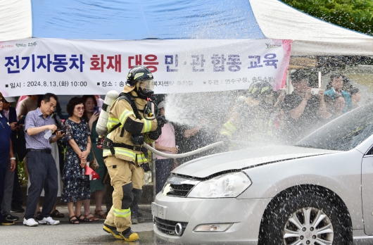 [뉴스서치] 연수구는 13일 송도2동 행정복지센터 주차장에서 지역주민을 대상으로 인천송도소방서 미래119안전센터와 함께 전기차 화재 대응 민관 합동교육을 진행했다.