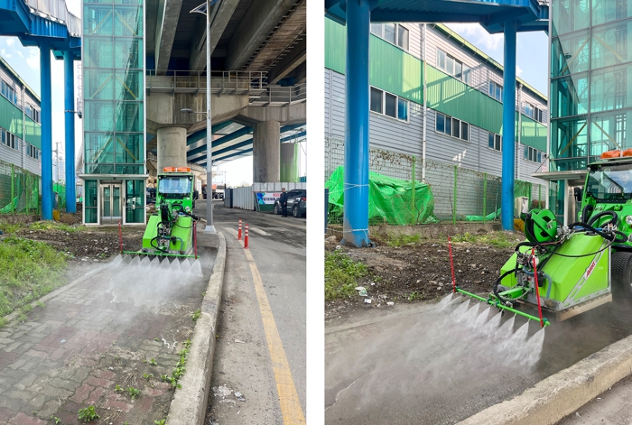 ▲ 대전 대덕구가 제설작업을 위해 도입한 스마트제설기에 고압 살수기를 장착해 보도블록을 청소하고 있다. |