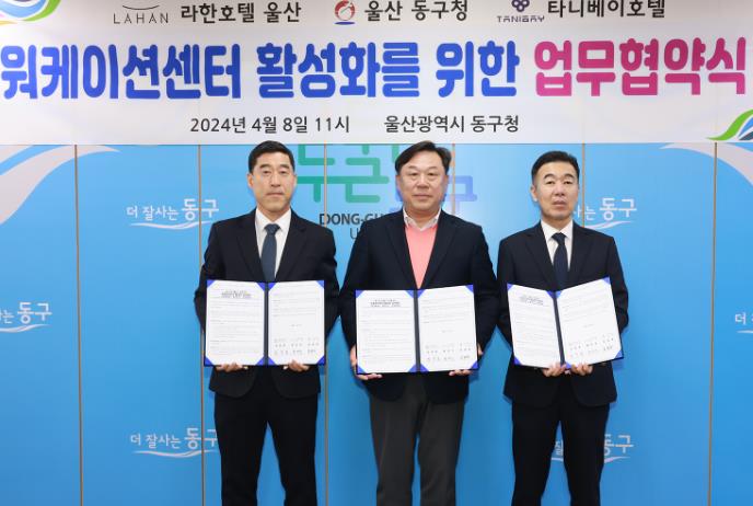 [뉴스서치] 울산 동구는 4월 8일 오전 11시 구청장실에서 새롭게 조성되는 워케이션센터의 활성화와 지역경제 활력 제고를 위한 지역 상권과의 상생 협력 첫 단계로 라한호텔 울산, 타니베이호텔과 업무협약을 체결했다.