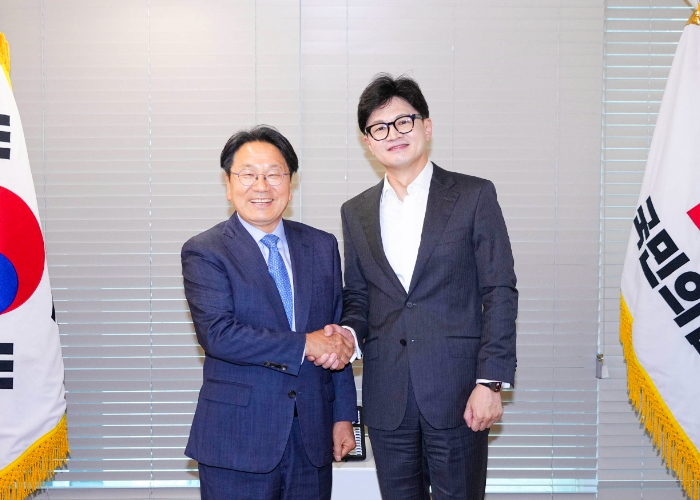 ▲ 강기정 광주광역시장(왼쪽)이 13일 오전 서울 여의도 국민의힘 당사를 찾아 한동훈 국민의힘 대표(오른쪽)와 악수를 하고 있다./광주광역시 제공 |