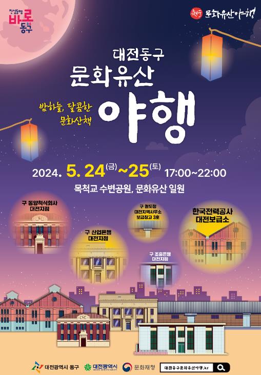 [뉴스서치] 대전 동구는 오는 24일부터 25일까지 이틀간 목척교 수변공원 및 동구 문화유산 일원에서, 2024년 대전 동구 문화유산 야행 ‘밤하늘, 달콤한 문화산책’을 개최한다고 20일 밝혔다.