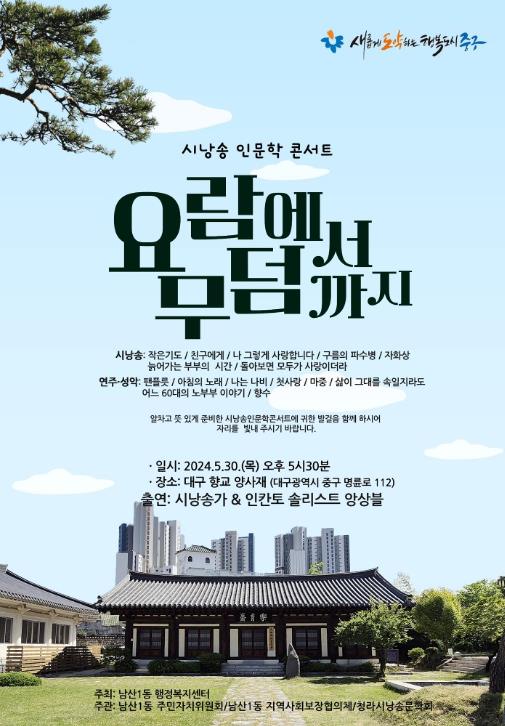 [뉴스서치] 대구 중구 남산1동 행정복지센터는 오는 30일 옛 선인들의 지혜와 지성이 깃든 대구향교 명륜당 광장(명륜로 112)에서 주민들을 위한 문화행사인 ‘요람에서 무덤까지’를 주제로 한 ‘인문학 콘서트’를 개최한다.