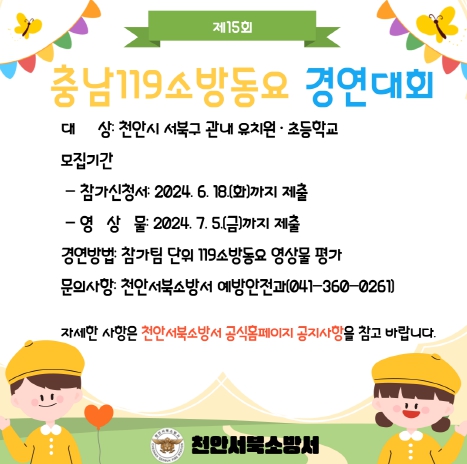 이번 대회는 소방동요를 통해 자연스럽게 안전 지식을 배울 수 있는 계기를 제공함에 목적이 있으며 참여 대상은 천안시 서북구 소재 유치원·초등학교 소속 학생들이다.