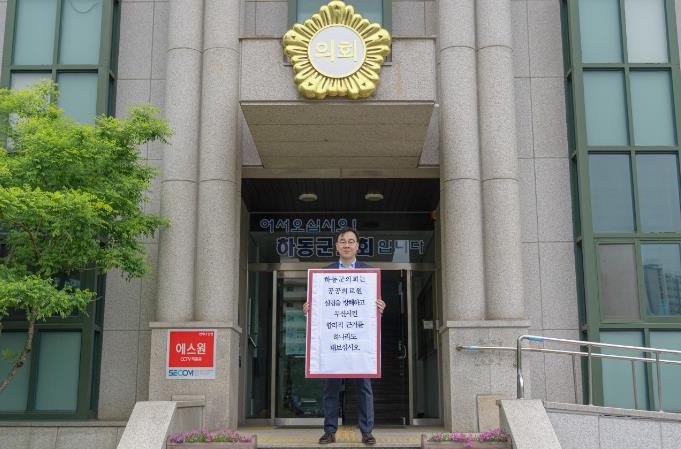 하승철 하동군수는 사실상 보건의료원 설립을 무산시킨 하동군의회에 합리적 근거를 요구하며 1인 시위를 이어갈 예정이라고 밝혔다.