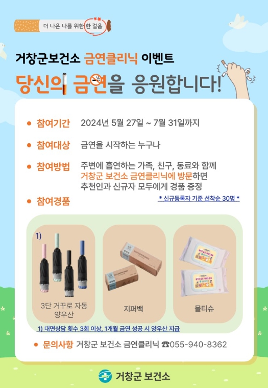[뉴스서치] 거창군은 5월 31일인 ‘제37회 세계 금연의 날’을 기념해 보건소 금연클리닉에서 5월 27일부터 7월 31일까지 ‘당신의 금연을 응원합니다.’라는 주제로 이벤트를 진행한다.