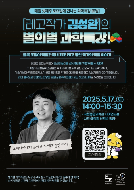 이번 특강에서는 정보통신 개발자로 활동하던 김성완 작가를 통해 레고예술(브릭 아트)에 적용된 균형, 구조, 기하학, 모듈화 등의 과학 원리를 생생하게 들어 볼 수 있으며 복잡해 보이는 블록 구조물 속에 숨어 있는 과학적 개념들은 관람객들에게 “블록 조립이 곧 과학적 탐구”임을 느끼게 해 줄 것이다.