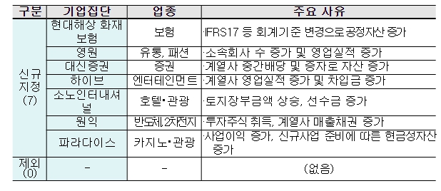 ▲ 공시대상기업집단 신규 지정 및 제외 사유 |