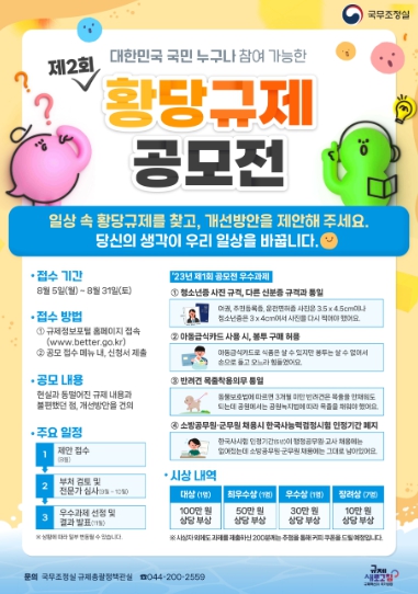 작년의 1회 공모전을 통해서는 △청소년증 사진 규격 통일 △아동급식카드 사용시 봉투구매 허용 등 작지만 생활 속 불편을 유발하는 규제를 찾아내 개선하는 성과를 거둔 바 있다.