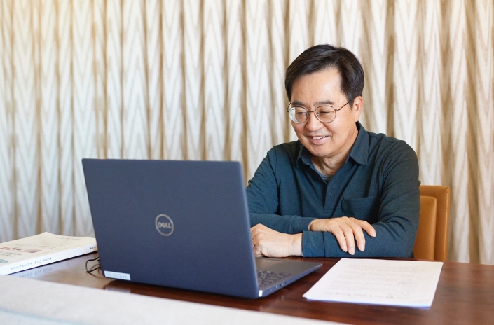 ▲ 현지시각 14일 오전 미국에서 김동연 경기도지사가, 행정1·2부지사, 경제부지사, 경기도소방재난본부장과 현안 업무점검을 위한 영상 회의를 하고있다. |