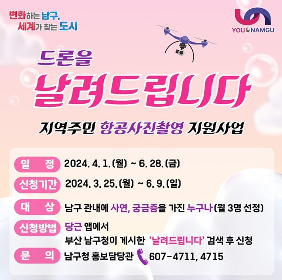 [뉴스서치] 부산 남구는 남구청이 보유한 전문 인력과 드론 장비를 활용하여 지역주민을 대상으로 항공사진 촬영 지원 사업을 추진한다.