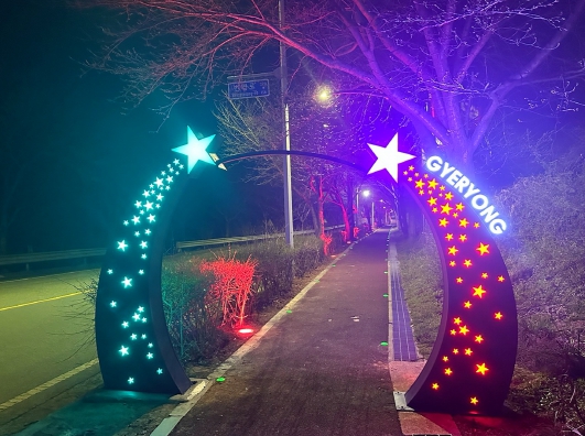[뉴스서치] 계룡시가 향적산 벚꽃길의 시작점인 엄사중~향한리 회전교차로 약 1㎞ 구간에 아름다운 경관조명의 불을 밝힌다.