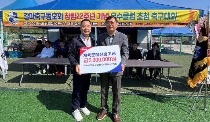 [뉴스서치] 합천 갈마축구동호회는 지난 14일 군민체육공원 인조구장에서 열린 창립 22주년 기념 우수클럽 초청 축구대회에서 합천군 체육발전 및 인프라 확충을 위해 써달라며 체육문예진흥기금 2백만원을 기탁했다.