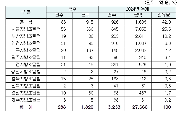 지역별 발주량을 보면 대전광역시 소재 본청 915억 원, 서울지방청 366억 원 등 2개청(1,281억 원)이 전체 금액(1,826억 원)의 70.2%를 차지하고 있으며, 인천 등 나머지 10개 지방청 545억 원이 각각 집행될 예정이다.