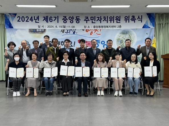 한편, 주민자치위원회 임원진은 최기대 위원장을 필두로 부회장 김재은 위원, 감사 이상용 위원, 사무국장 박희자 위원으로 구성됐으며, 제6기 중앙동 주민자치위원회의 임기는 2024년 4월 1일부터 2025년 3월 31일까지 이다.