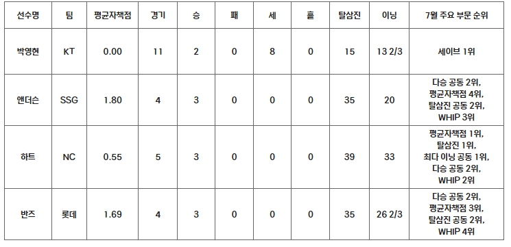후반기 KT가 보여주고 있는 상승세의 한 축에는 마무리 투수 박영현이 있다. KT가 7월에 치른 19경기 중 11경기, 13과 2/3이닝을 투구하며 단 하나의 실점도 허용하지 않았다. 특히 11경기 중 6경기에서 1이닝이 넘는 투구를 펼치며 마무리로서 많은 이닝을 소화했음에도 불구하고 호투를 펼쳤다. 박영현은 평균자책점 0.00과 함께 8세이브로 해당 부문 1위를 차지했다.