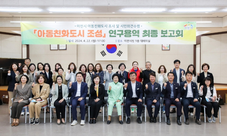 [뉴스서치] 이천시는 지난 4월 22일 이천시청 대회의실에서“아동친화도 조사 및 시민의견수렴 연구용역 최종보고회”를 아동친화도시 추진위원회, 아동 옴부즈퍼슨, 실무추진단, 아동관련 유관기관, 아동돌봄 유관기관 관계자 60여명이 참석한 가운데 개최됐다.