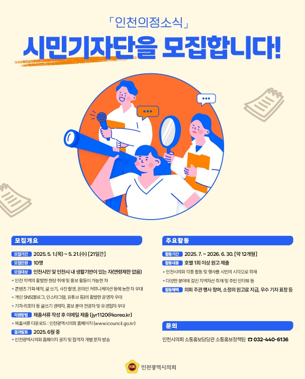 [뉴스서치] 인천광역시의회에서 의정활동과 다양한 지역 소식을 전할 시민기자를 찾고 있다.