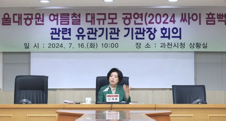 [뉴스서치] 과천시는 서울대공원(과천시 막계동)에서 오는 20일과 21일에 이틀간 열리는 “싸이 흠뻑쇼 섬머 스웨그 2024‘를 앞두고, 16일 시청 상황실에서 안전 대비책 점검을 위해 신계용 과천시장과 공연업체, 서울대공원, 과천소방서, 과천경찰서 등 관계 기관장이 참석한 가운데 회의를 실시했다.