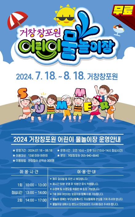 거창창포원 어린이 물놀이장은 사계절 어린이 놀이터와 에어풀, 워터슬라이드 2세트, 조립식 풀장 등 물놀이 시설과 샤워실, 탈의실, 그늘막 등 편의시설이 있어 야외에서 물놀이를 즐겁고 편하게 즐길 수 있다.
