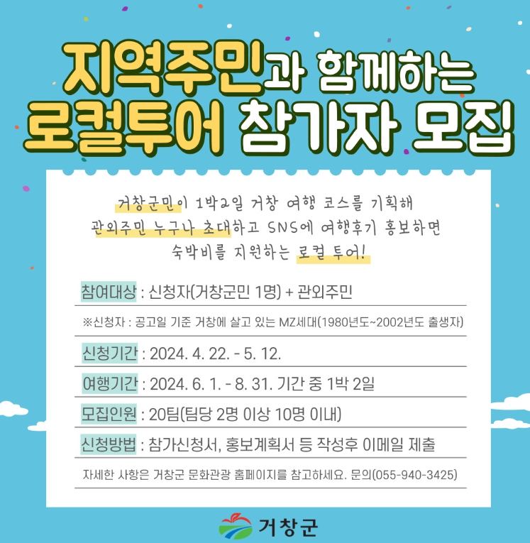 [뉴스서치] 거창군은 거창군민이 나만의 여행코스를 기획하고 관외 주민을 초대해 1박 2일 거창을 여행하면 숙박비를 지원하는 로컬 투어 프로그램 참가자를 모집한다.
