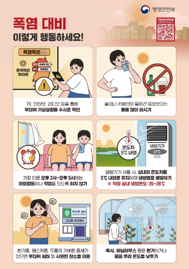 이한경 재난안전관리본부장은 “정부는 관계기관과 함께 야외·이동노동자, 노숙인, 고령 농업인 등 폭염 취약계층이 안전하게 여름을 보낼 수 있도록 세심하게 지원해 나가겠다”라고 밝혔다.