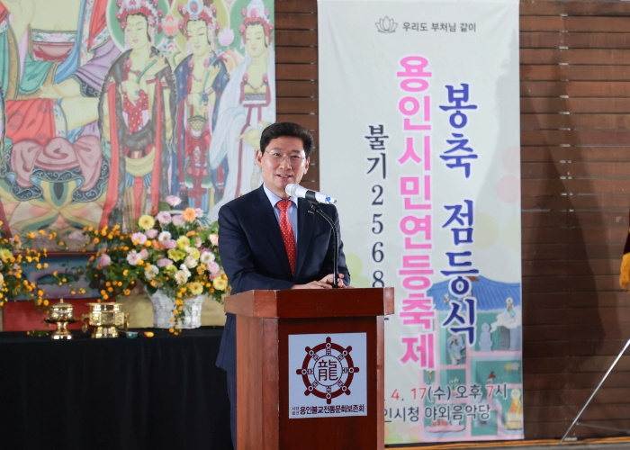 이상일 시장은 축사를 통해 “불기2568년 부처님 오신 날을 맞이해 연등축제의 시작을 알리는 봉축 점등식이 열리게 된 것을 참으로 뜻 깊게 생각한다”며 “오늘 우리가 밝히는 등불이 마음속 어둠과 번뇌를 물리치고, 대한민국 국민에게는 자비로운 마음이 자리 잡을 수 있는 씨앗이 되기를 바란다”고 말했다.