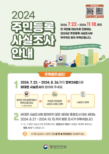 22일 9시부터 오는 8월 26일까지는 ‘비대면-디지털 조사’(이하 ‘비대면 조사’)를 진행하며 8월 27일부터 10월 15일까지는 이·통장 및 읍·면·동 공무원이 거주지를 방문하여 직접 확인하는 방문 조사 방식으로 진행할 예정이다.