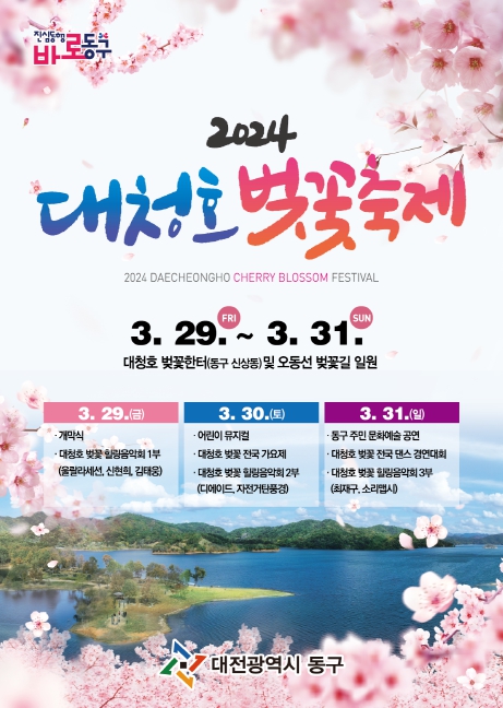 대전 동구는 오는 29일부터 31일까지 3일간 대청호 벚꽃한터 및 오동선 벚꽃길 일원에서 ‘2024 대청호 벚꽃축제’를 개최한다고 22일 밝혔다.