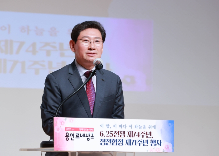 ▲ 25일 용인특례시청 에이스홀에서 열린 6.25전쟁 제74주년·정전협정 제71주년 행사에서 인사말을 하고 있는 이상일 시장 |
