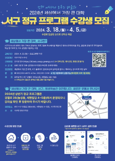 [뉴스서치] 광주광역시 서구는 ‘세상에서 가장 큰 대학, 서구(이하 세큰대)’ 상반기 정규 프로그램 수강생을 4월 5일까지 모집한다.