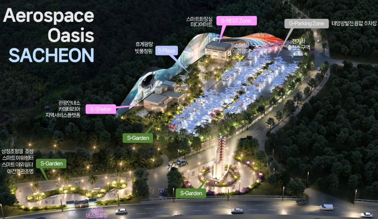 ‘사천 에어로스페이스 오아시스 스마트복합쉼터’는 친환경차 충전시설, 태양광 설비 등 다양한 스마트 기술을 적용해 사천IC 주변 일대(축동면 사다리)에 약 10,000㎡ 규모로 조성된다.