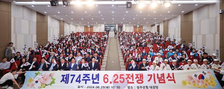[뉴스서치] 성주군에서는 6.25전쟁일을 맞이하여 성주군보훈단체연합회 주관으로 6.25참전유공자 외 보훈단체 회원 및 학생 등 200여명이 참석한 가운데 군청 대강당에서 6.25전쟁 제74주년 기념행사를 개최했다.
