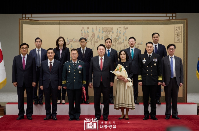 ▲ 4월 24일 윤석열 대통령은 용산 대통령실에서 강호필 신임 합참차장으로부터 진급 및 보직 신고를 받고 삼정검 수치를 수여했다. |