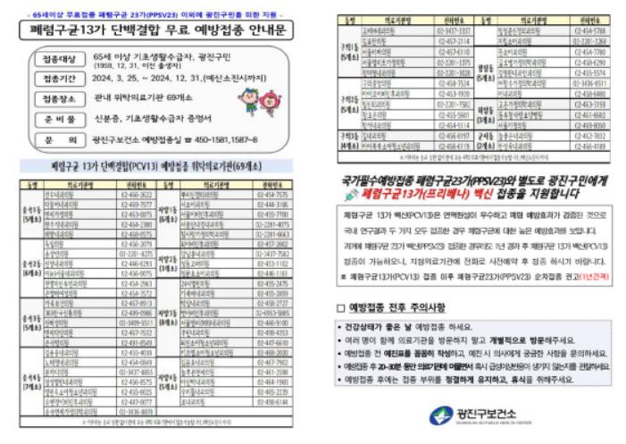지원 대상은 광진구에 주민등록이 되어 있는 65세 이상(1959. 12. 31. 이전 출생) 기초생활수급자로, 예방접종 희망 시 신분증과 수급자증명서를 지참해 관내 지정의료기관으로 방문하면 된다.