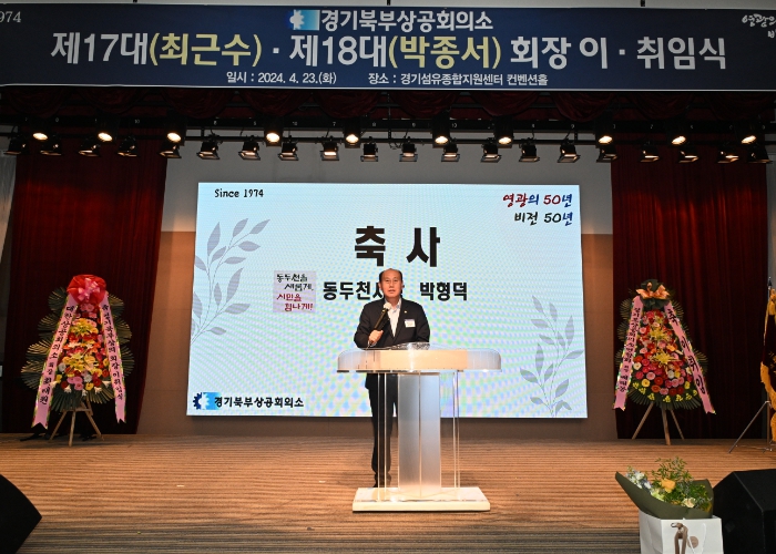 [뉴스서치] 박형덕 동두천시장은 23일 경기섬유종합지원센터 컨벤션홀에서 열린 경기북부상공회의소 이취임식에 참석해 제17대 최근수 회장의 노고에 감사하고 제18대(박종서) 회장의 취임을 축하했다.