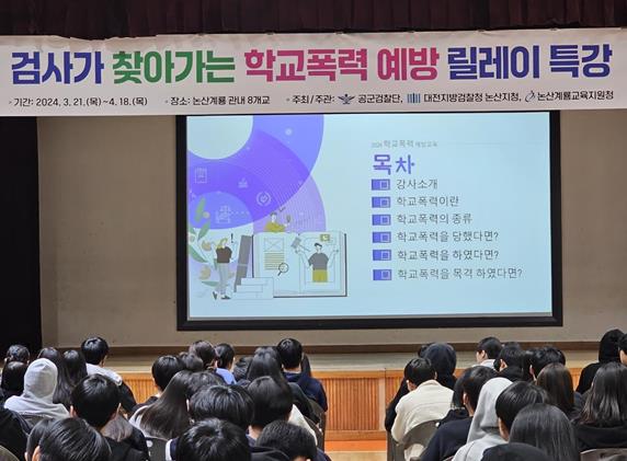 [뉴스서치] 논산계룡교육지원청은 공군 검찰단(단장 김형찬), 대전지방검찰청 논산지청(지청장 김가람)과 함께 2024. 3. 21.부터 4. 18.까지 전국 최초로 2개‘검사가 찾아가는 학교폭력 예방 릴레이 특강’을 실시한다고 전했다.