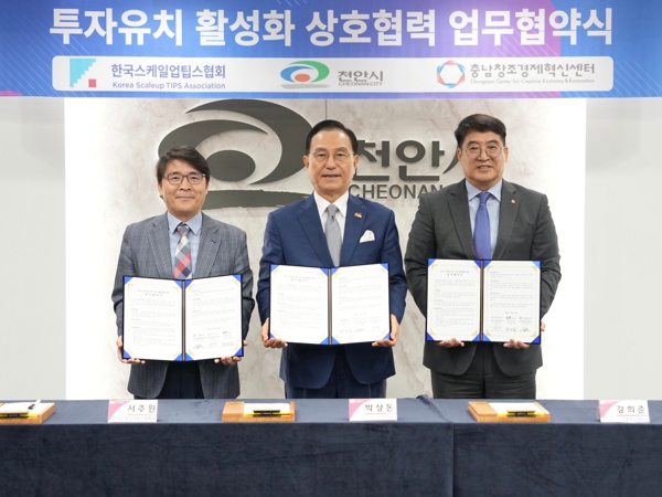 천안시는 24일 한국스케일업팁스협회, 충남창조경제혁신센터와 ‘지역 스타트업의 투자유치 활성화’를 위한 상호협력 업무협약을 체결했다.