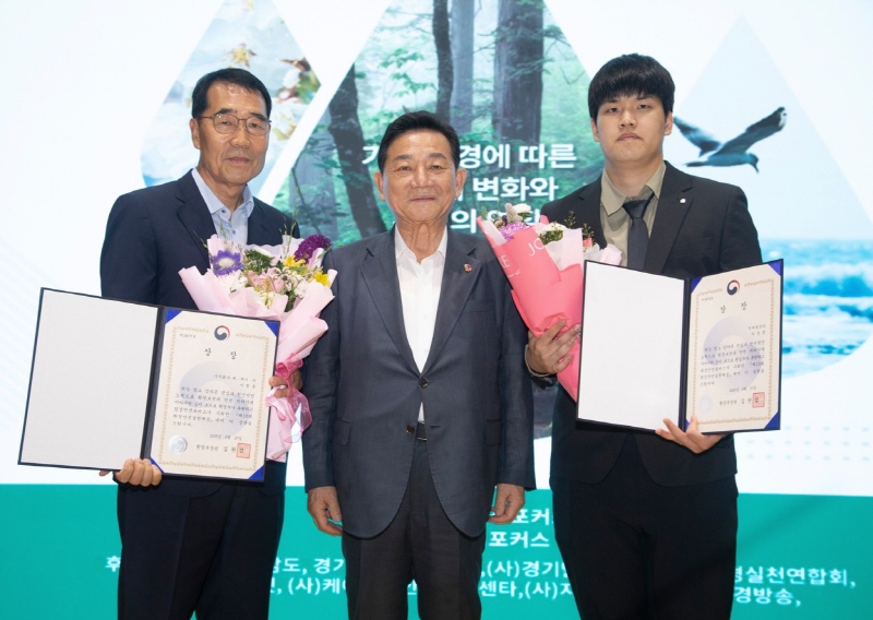 ▲ 왼쪽 환경부장관 수상자 서형운 가운데 대회장 공원식 오른쪽 환경부장관 수상자 이경훈이 기념촬영을 하고 있다. © 사진=인디포커스 김한솔 기자 |
