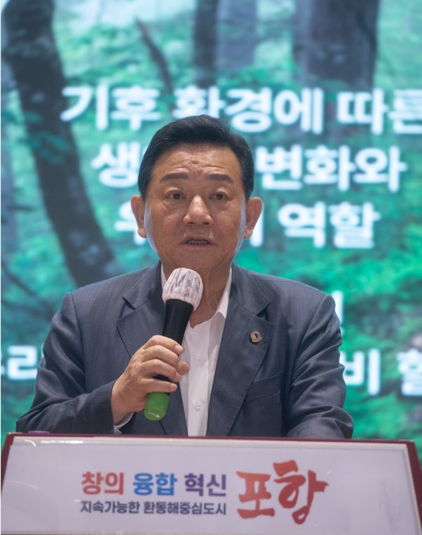 신복용 명예대회장은 축사에서 ”50만 시민은 굉장히 침착하고 대응 능력이나 기후 환경에 대해서 뛰어난 능력을 가지고 있다고 생각한다“면서 ”좀 더 좋은 환경을 만들고 보전하면서 아름다운 포항시를 만들어가기를 간절히 희망한다“고 말했다..