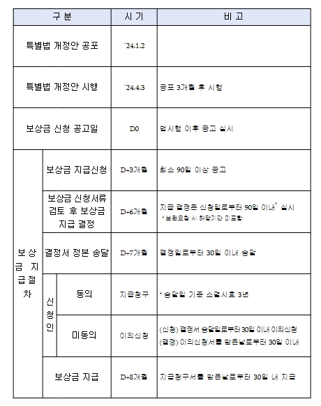 올해 4월 3일부터 「내수면가두리양식업보상법」 및 동법 시행령 개정안이 시행되면, 해양수산부는 보상대상자가 누락되지 않도록 어업인 현장 설명회 등을 통해 보상신청을 적극 안내할 예정이다. 이후 손실보상금 신청공고를 시작으로 보상금 지급 절차를 개시한다.