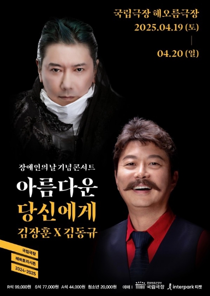 '공연의 신' 김장훈의 록과 바리톤 김동규의 클래식 음악, 국립극장의 최고 수준의 음향, 조명, 연출이 만나 풍성한 선율과 감동을 선사할 '아름다운 당신에게’ 콘서트는 국립극장 홈페이지와 인터파크티켓에서 티켓 예매할 수 있다.
