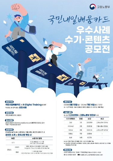 [뉴스서치] 고용노동부는 '2024년 국민내일배움카드 우수사례 수기·콘텐츠 공모전'을 개최한다. 희망자는 6월 10일부터 7월 14일까지 공모전 홈페이지를 통해 응모할 수 있다.