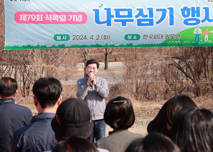 ▲ 이상일 용인특례시장이 2일 한국외대 글로벌캠퍼스 입구 주차장 인근 임도변에서 열린 나무심기 행사에서 인사말을 하고 있다. |