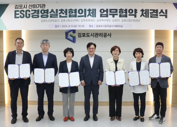 [뉴스서치] 민선8기 김포시가 시 산하 6개 공공기관이 시의 비전을 공유하고 같은 목표를 지향하고자 9일 ‘ESG경영실천협의체 협약’을 체결하고, 더 강화된 협력으로 김포시의 발전을 이끄는 데 뜻을 모았다고 밝혔다.